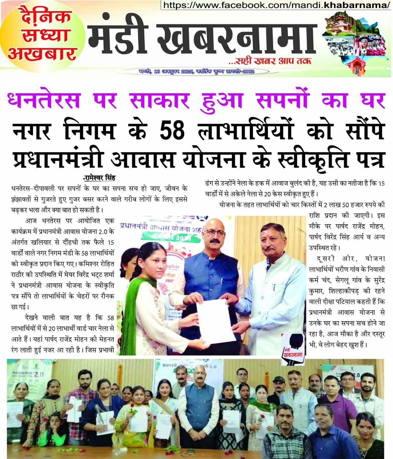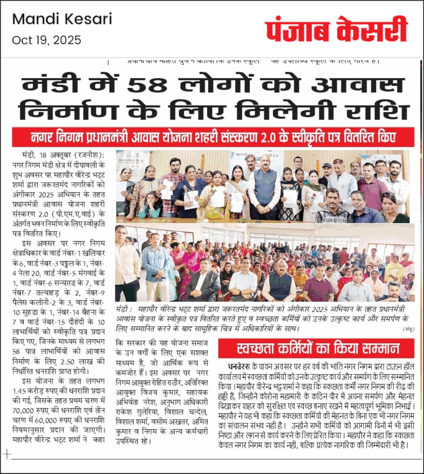 Honorable Mayor of Municipal Corporation, Shri Virender Bhatt Sharma distributed Sanction letters to needy person under Pradhan Mantri Awas Yojana Urban Version 2.0 under Angikaar 2025 campaign.